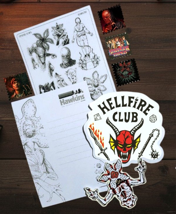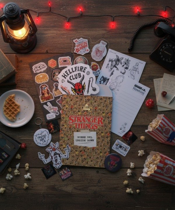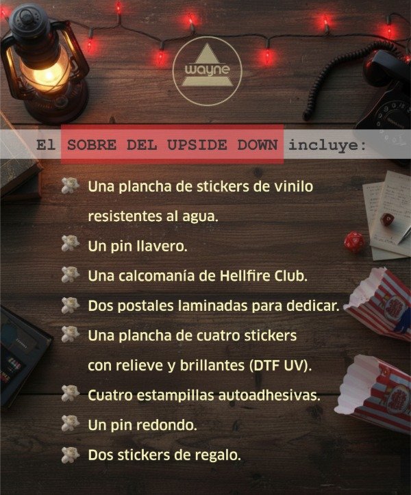Sobre de 15x21cm contenedor de papelería, stickers y pines sólo para fanáticos de Stranger Things! Incluye: Una plancha 14x20cm de stickers de vinilo resistentes al agua con momentos icónicos de la serie, un pin llavero de 5,5cm de diámetro, una calcomanía gigante de Hellfire Club, dos postales 13x18cm laminadas del lado del frente y para dedicar del lado de atras, una plancha de cuatro stickers con relieve y brillantes (DTF UV) para que puedas pegar sobre metal, vidrio y madera, cuatro estampillas autoadhesivas de 3,5cm, un pin redondo de 5,5cm de diámetro y dos pequeños stickers de regalo según stock.